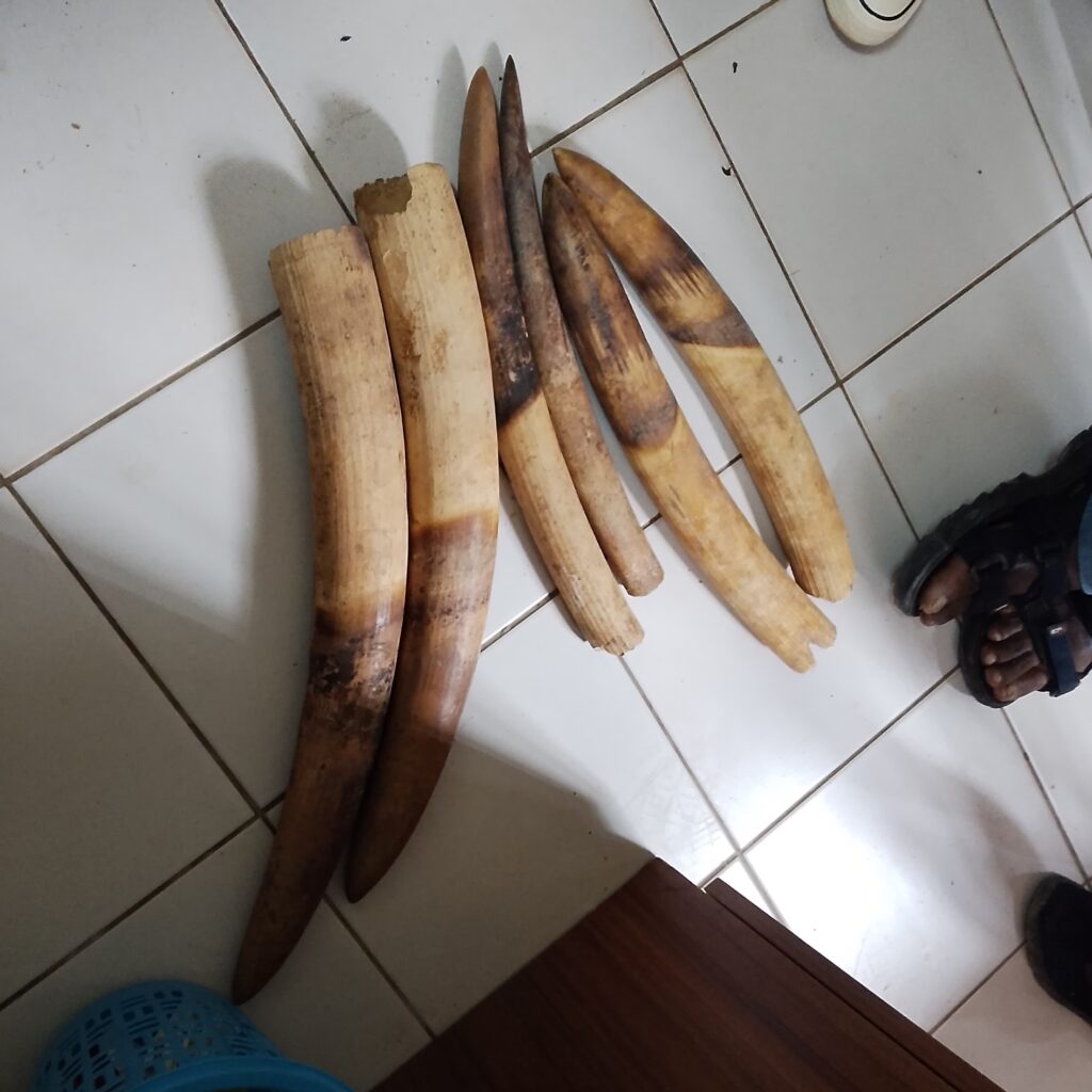 Dans le cadre d’une opération conjointe menée à Oyem, dans la province du Woleu-Ntem, la Direction de la Lutte Contre le Braconnage du ministère des Eaux et Forêts (DLCB), la Direction Provinciale des Eaux et Forêts du Woleu-Ntem et la Direction Générale de recherche (DGR) d’Oyem, appuyées par l’ONG Conservation Justice (CJ), ont appréhendé le 25 avril 2025, trois présumés trafiquants d’ivoire avec en leur possession, six pointes d’ivoire entières qu’ils tentaient de vendre.